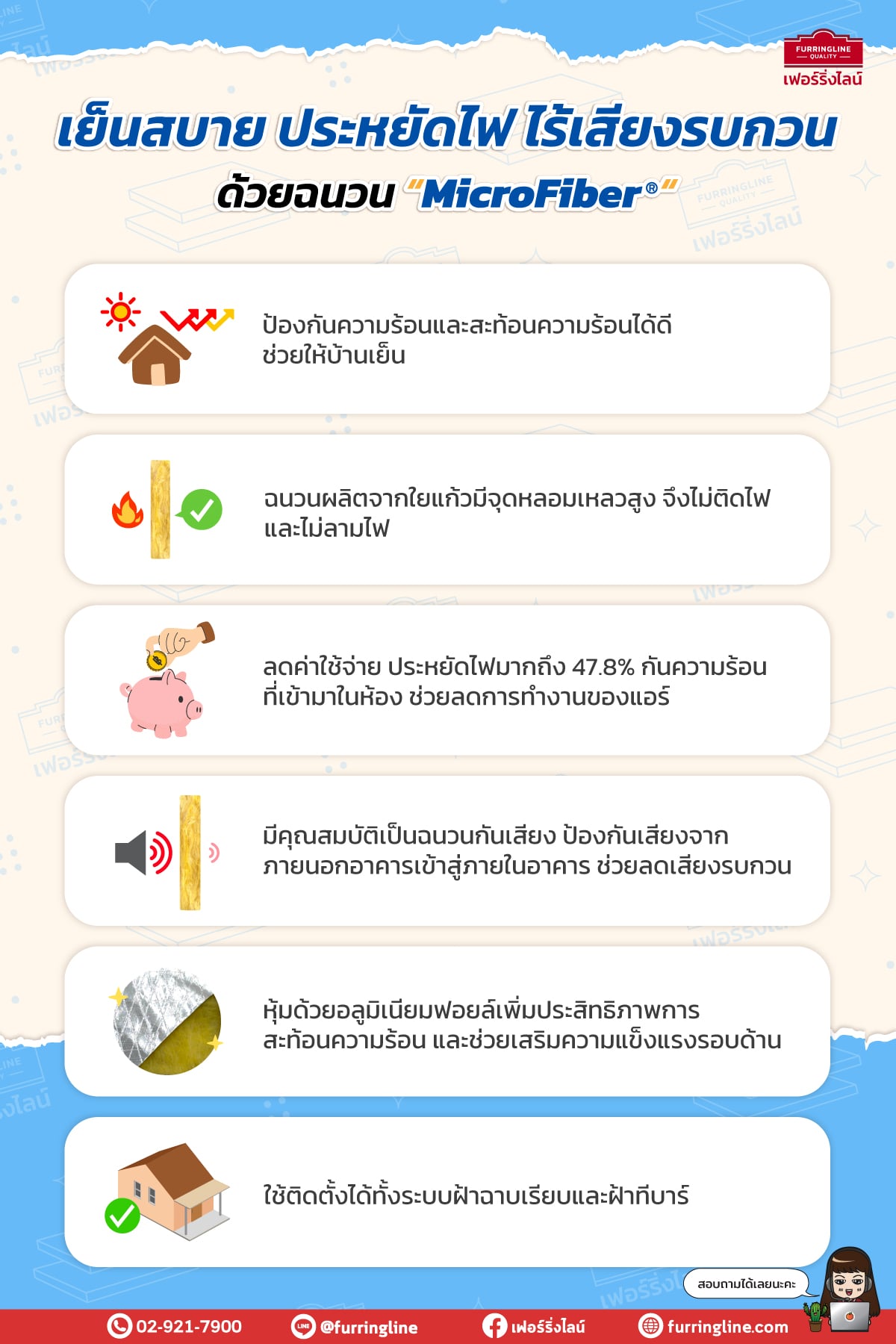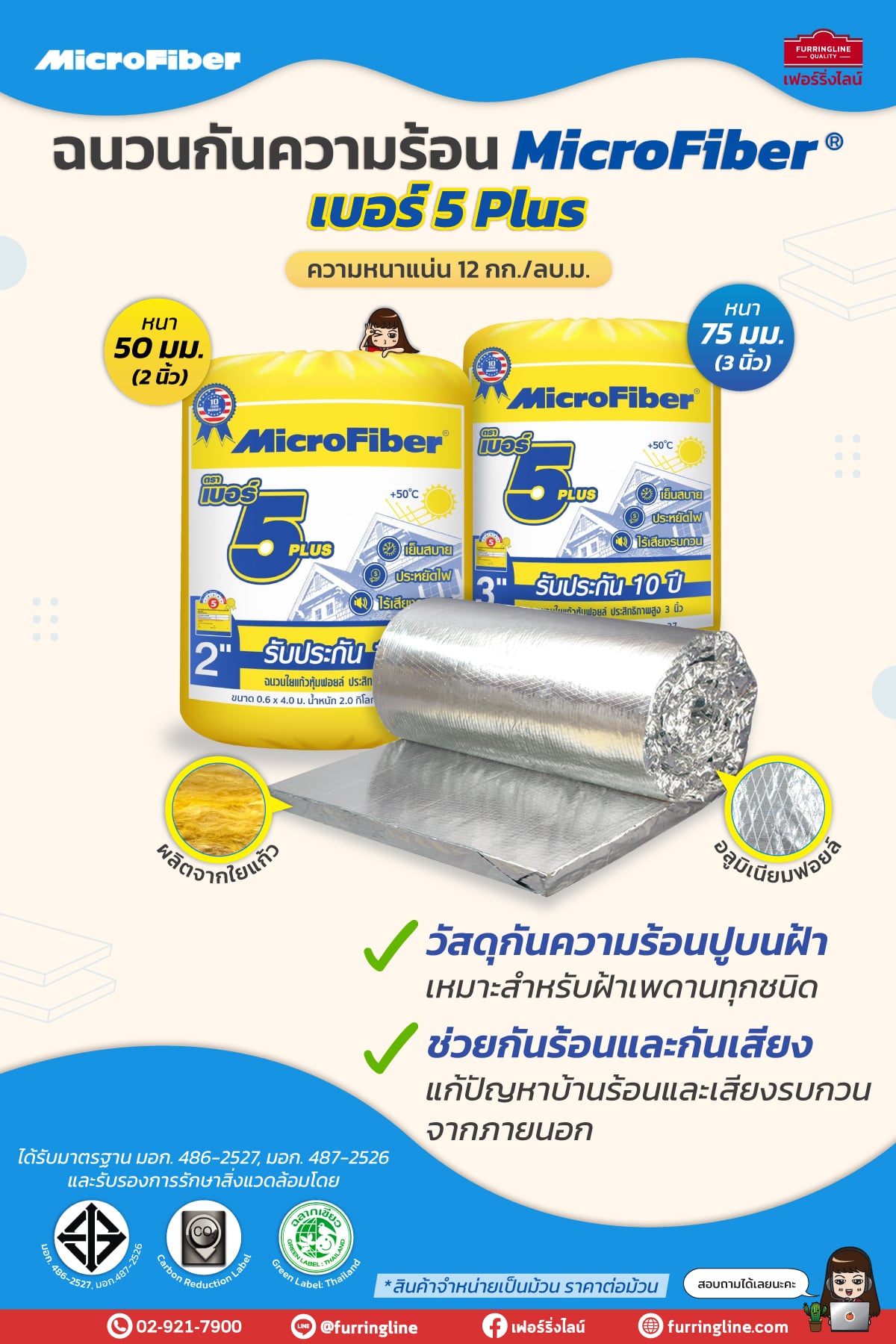 ฉนวนกันความร้อน MicroFiber เบอร์ 5 Plus หนา 75 มม. (3 นิ้ว) คือ วัสดุกันความร้อนสำหรับฝ้าเพดาน ผลิตจากใยแก้ว หุ้มรอบด้านด้วยอลูมิเนียมฟอยล์ สะท้อนความร้อนได้ดีทำให้บ้านเย็น ประหยัดค่าไฟได้ถึง 57.8% และสามารถช่วยลดปัญหาเสียงรบกวนได้ ติดตั้งง่าย อายุการใช้งานยาวนาน ปลอดภัยไม่เป็นอันตรายต่อสุขภาพ เป็นมิตรกับสิ่งแวดล้อม ได้รับมาตรฐาน มอก. 486-2527, มอก. 487-2526 และรับรองการรักษาสิ่งแวดล้อมโดย ฉลากเขียว Green Label: Thailand