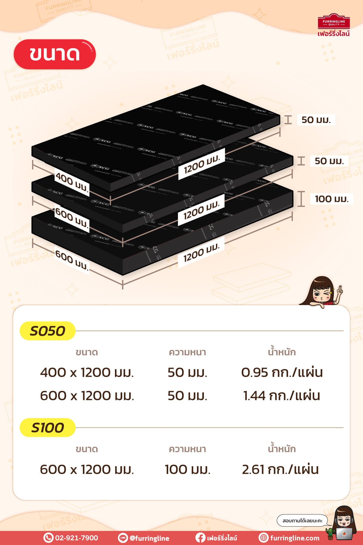 600 x 1200 x 100 มม. – น้ำหนัก 2.61 กก./แผ่น